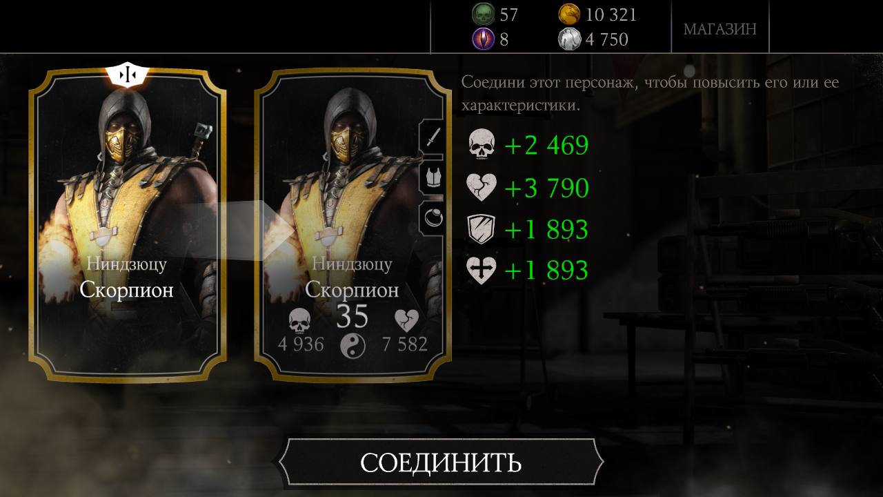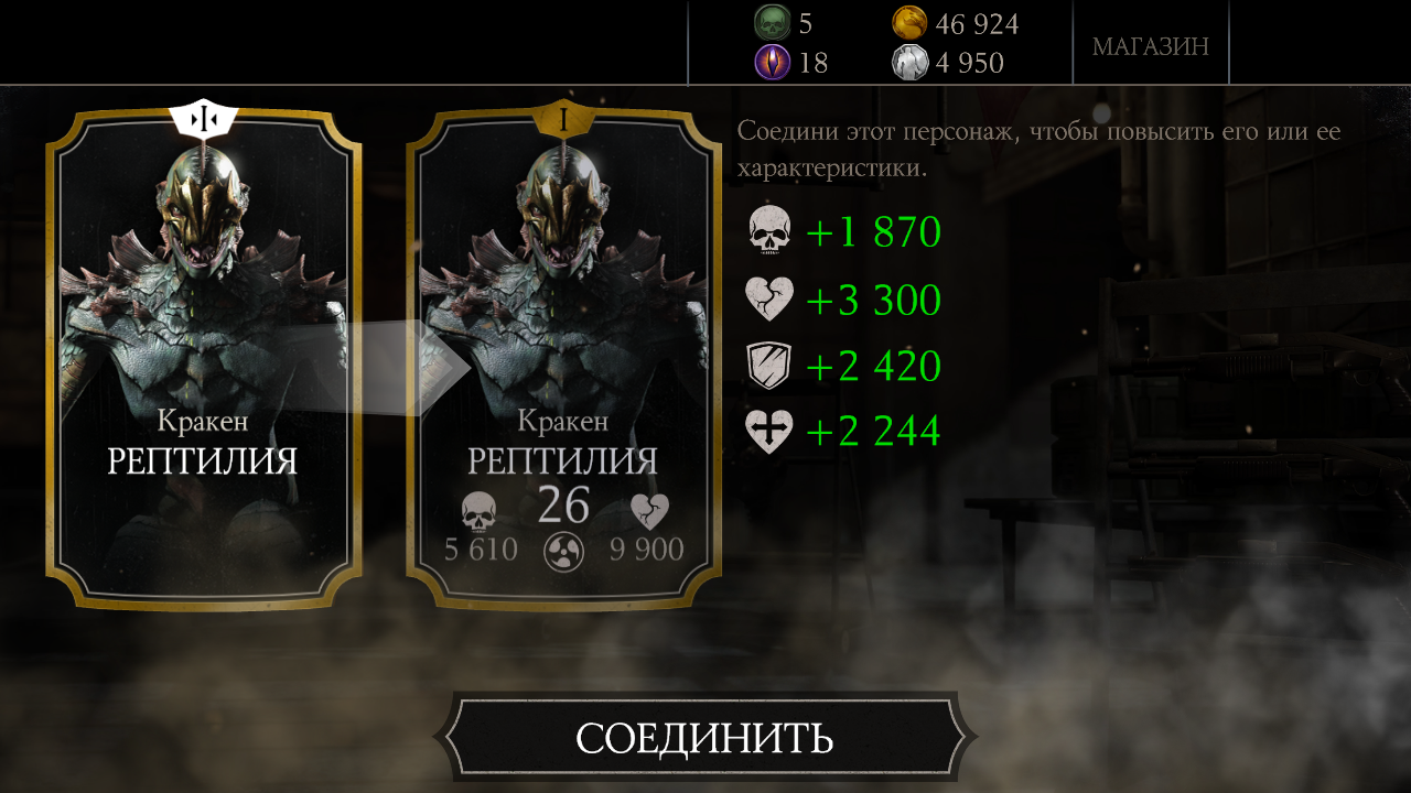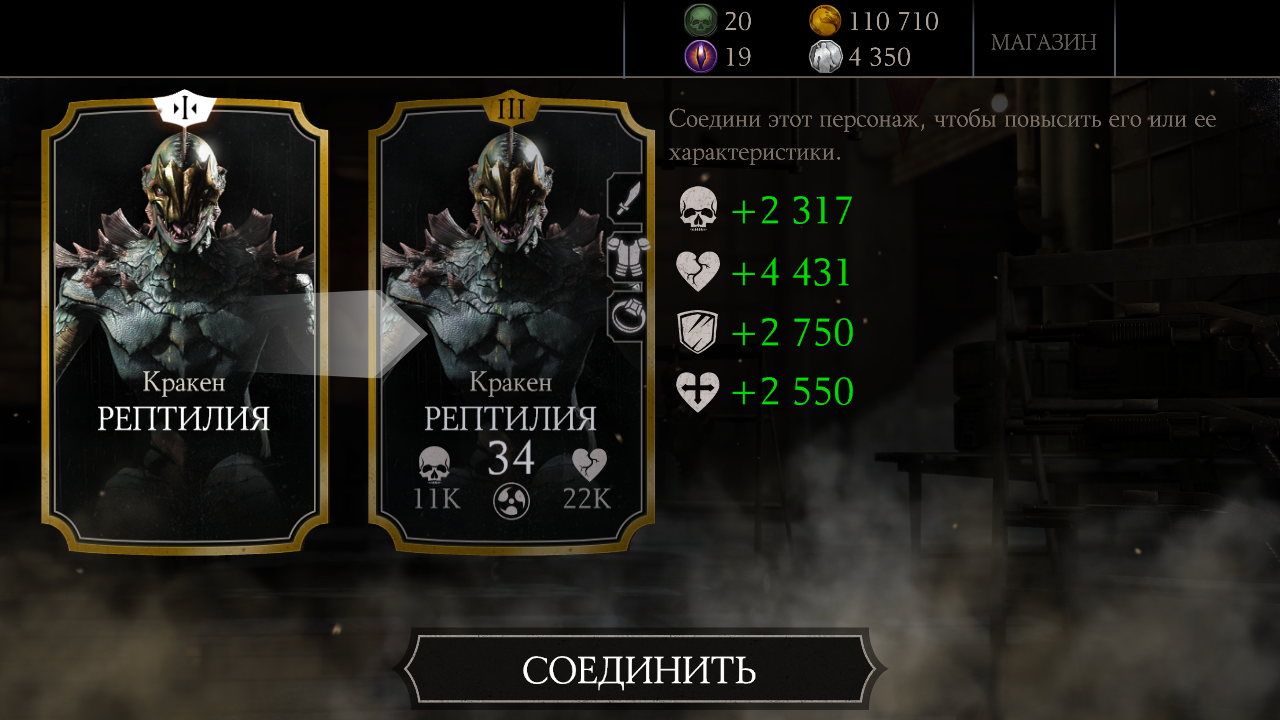 Куплен еще один Элитный пак (со скидкой 25%) и еще один Кракен Рептилия, блин! Мой Кракен имеет уже четыре слияния. Третье слияние было тут: Mortal Kombat X Mobile: Журнал прохождения (Сообщение отдельно: #1995). У меня уже целая банда Кракенов!