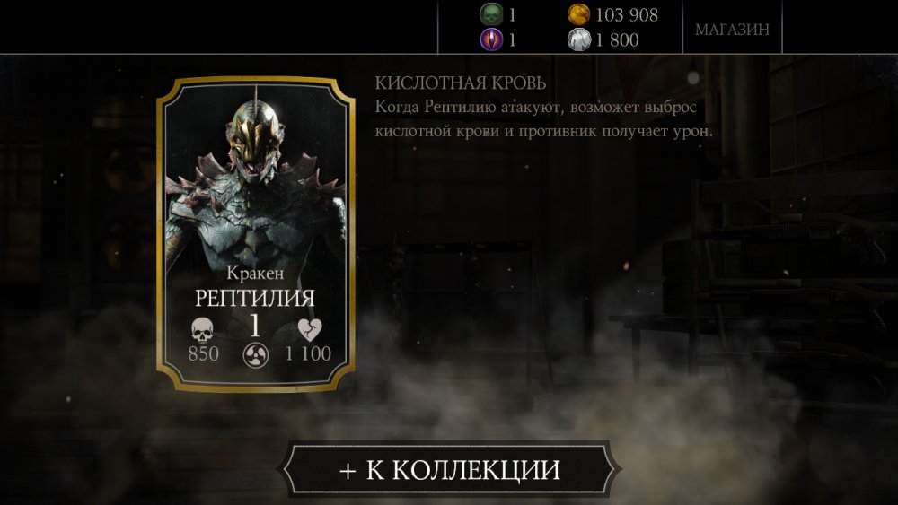 Я решил начать игру заново, об этом писал тут: Mortal Kombat X Mobile: Журнал прохождения. И уже в новом прохождении я только что открыл элитный набор за 360 душ. В наборе было восемь карточек: пять карточек поднятия уровня, карта Камни элементов и Топор палача. Восьмая карта была Кракен Рептилия. Для интереса хотел глянуть стоимость этой Рептилии, но не нашел эту карточку в магазине...