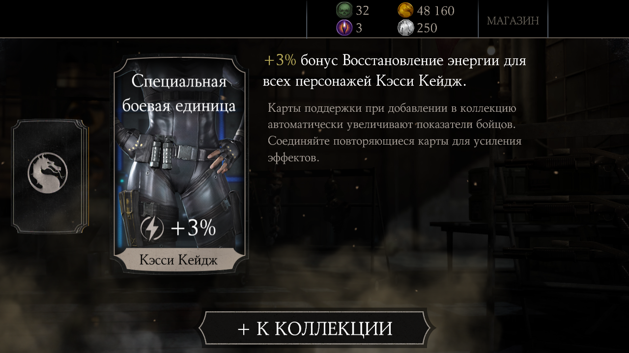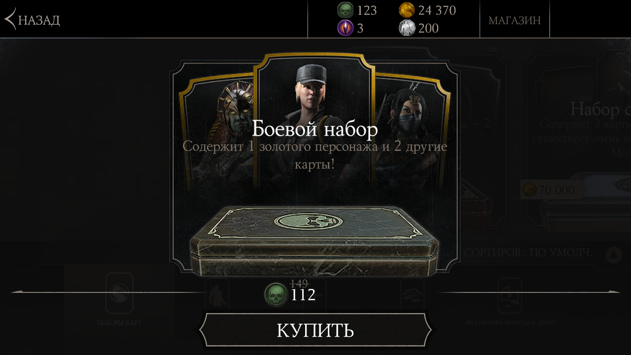 Сегодня скидка еще активна, я накопил на Боевой набор за 150 душ, который по скидке стоит 112 душ, и вот, что у меня выпало: карта восстановления энергии для всех персонажей Кэсси Кейдж, бонус здоровья всех персонажей Дрожь, третья карточка (золотая) Ниндзюцу Скорпион.