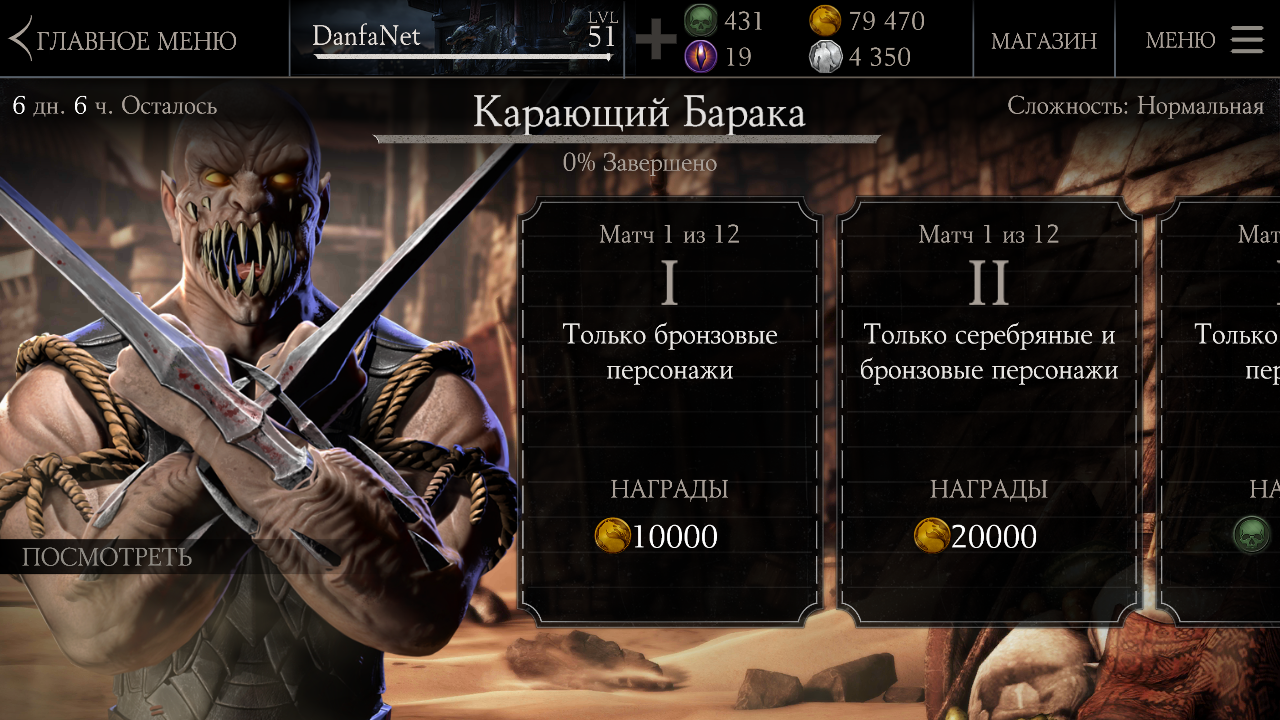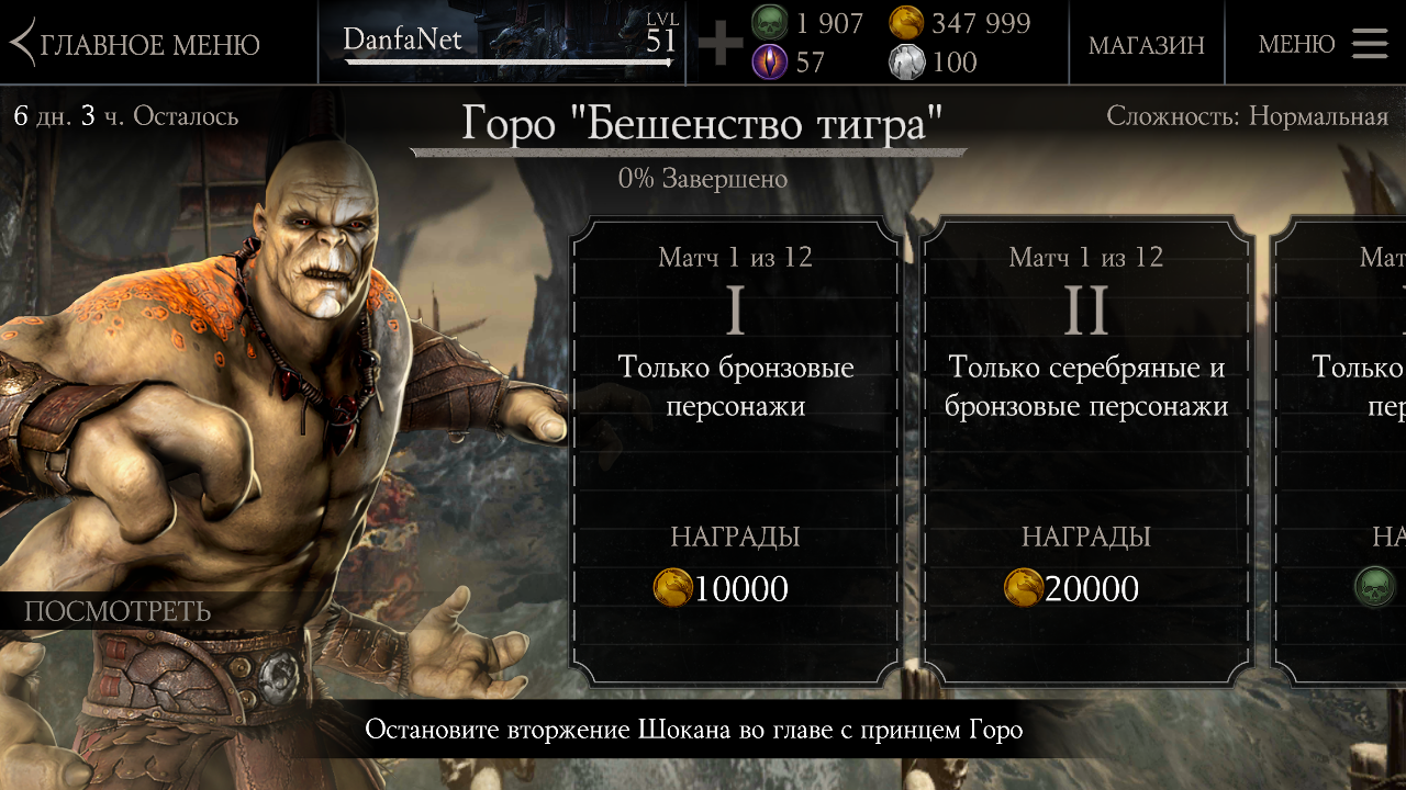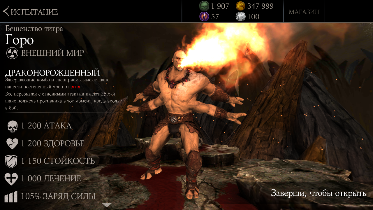 Данное испытание уже было: Испытания Mortal Kombat X Mobile (Сообщение отдельно: #1962), но я его не смог пройти по причине отсутствия Рейдена в моей коллекции персонажей. В этот раз у меня аж три Рейдена и я прошел испытание! За прохождение испытания, игрока награждают золотой карточкой Горо: Бешенство тигра с параметрами - 1200 удар и 1200 жизнь. Карточка теперь доступна в магазине персонажей по цене - 480 душ. За прохождение испытания в сложном режиме игрок получит слияние Горо и Клыки дракона.