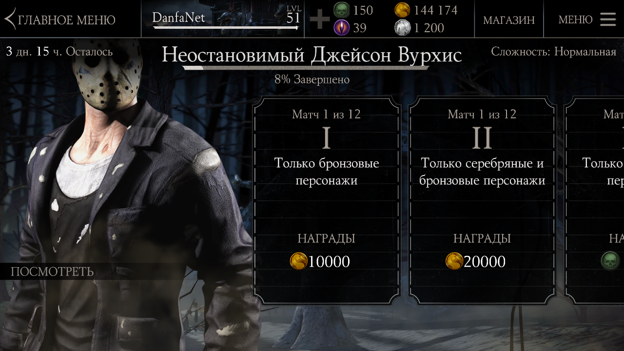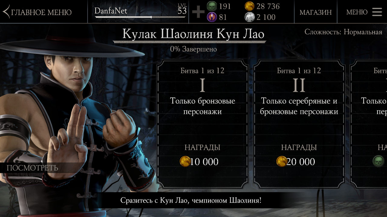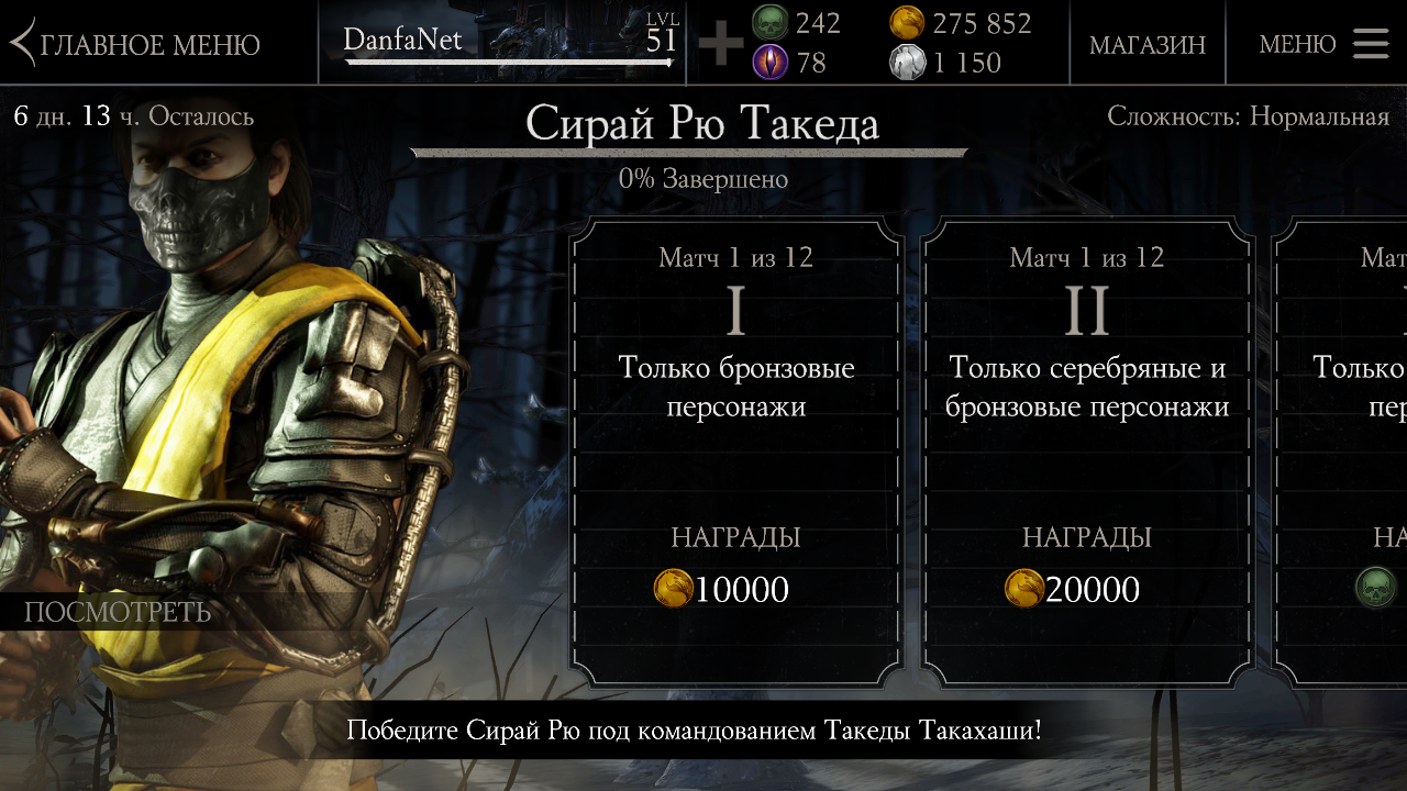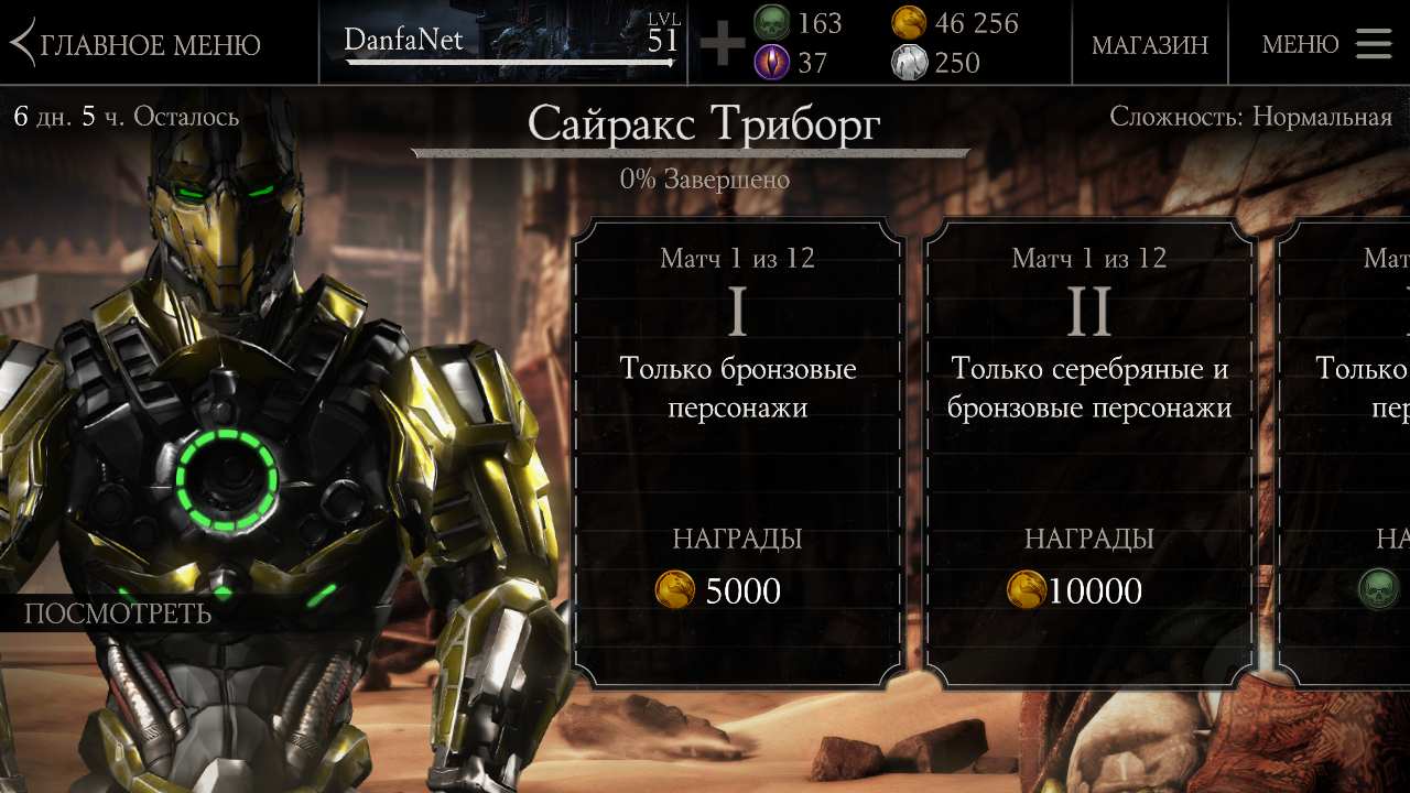 Данное испытание уже было: Испытания Mortal Kombat X Mobile (Сообщение отдельно: #1962), но я его не смог пройти по причине отсутствия Рейдена в моей коллекции персонажей. В этот раз у меня аж три Рейдена и я прошел испытание! За прохождение испытания, игрока награждают золотой карточкой Горо: Бешенство тигра с параметрами - 1200 удар и 1200 жизнь. Карточка теперь доступна в магазине персонажей по цене - 480 душ. За прохождение испытания в сложном режиме игрок получит слияние Горо и Клыки дракона.