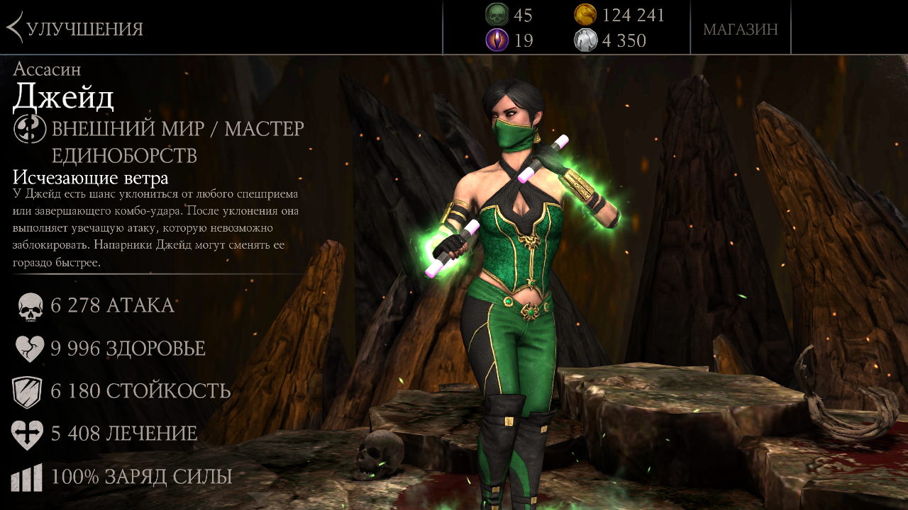 Пройдя свое первое испытание, меня наградили красавицей Джейд с префиксом Ассасин (Испытания Mortal Kombat X Mobile). Поиграл за данного персонажа и теперь хочу поговорить о ней. Как мне показалось к Джейд надо привыкнуть (наверно, как ко всем). Когда играл за нее первый раз, я видел ее, как "неуклюжую", потому, что там, где я мог размотать всю вражескую команду, например, одним слабым Ящером, а с Джейд разматывают меня. У Джейд есть способность уходить от спецприемов и завершающих комбо ударов. Перед нанесением тяжелого удара она может исчезнуть, этим сохранив себе жизнь, кроме того, после покушения на Джейд, она бьет с размаха по врагу. Уверен, эта способность вызывает восторг у игроков, которые играют за нее и лютую ненависть у тех, кто играет против нее. Когда играю против нее, стараюсь не использовать спецприемы и удары, что завершают серею ударов, но иногда все же нажму, то что нажимать не следовало, машинально.
