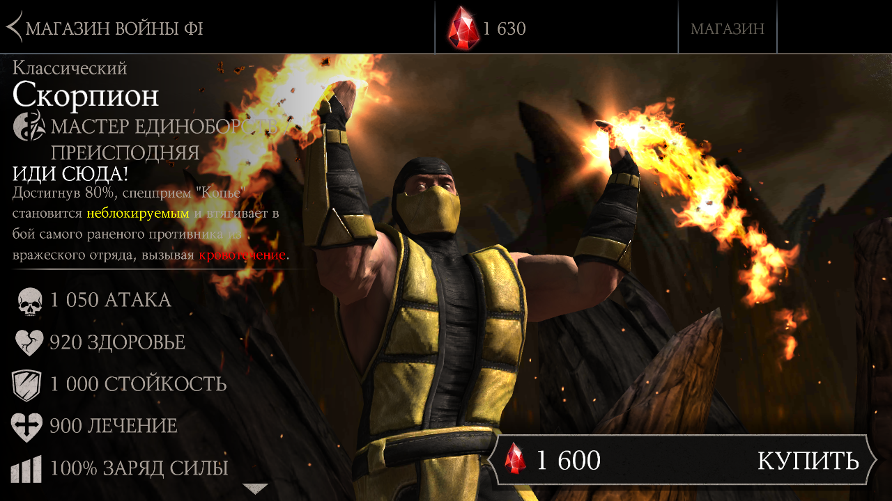 Классического Скорпиона можно купить в Магазине Воин Фракции за 1600 Кровавых рубинов. Его начальные показатели: 1050 удар и 920 жизнь. Классический Скорп одновременно является Мастером единоборств и из Преисподней, что на мой взгляд очень круто.