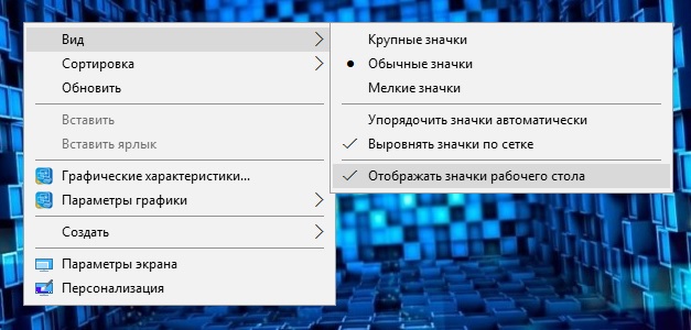 Значит, вызываем контекстное меню, нажатием правой кнопки мыши, наведя курсор на свободную область рабочего стола. В меню выбираем пункт "Вид", должны появиться подпункты меню, где необходимо установить галочку на Отображать значки рабочего стола.
