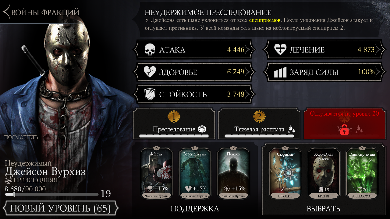 Джейсон Вурхиз: Неудержимый выпал мне из Редкого набора при первой закупке пака по временной акции (исал об этом тут: Mortal Kombat X Mobile: Открытие набора (Сообщение отдельно: #2107)). Я был уверен, что выпадет то, что уже у меня есть, но фортуна улыбнулась мне во весь рот, и вот "он" в моей коллекции!