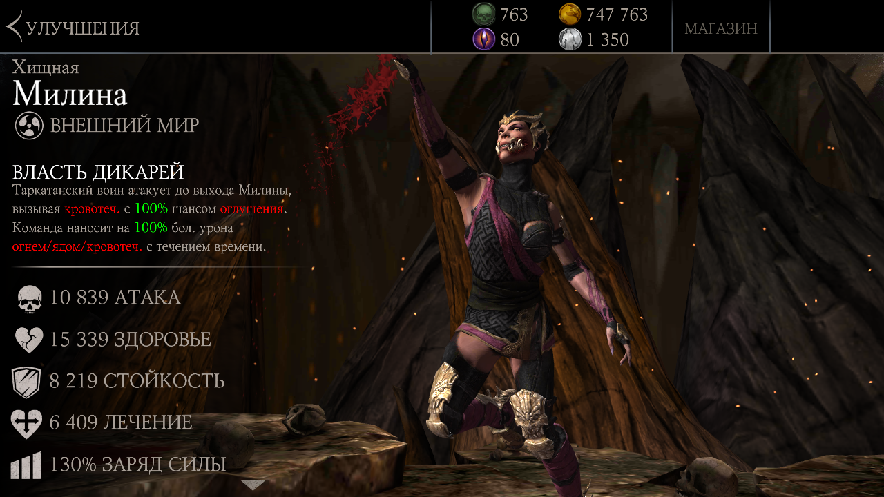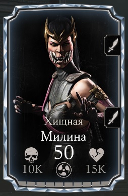 Хищная Милина один из самых сильных персонажей в MK X Mobile. Заметьте, на скриншоте Милина не имеет слияний, а ее удар составляет 10k, и у нее нет Молота гнева. Как мне кажется это не мало для карточки не имеющей ни одного слияния.