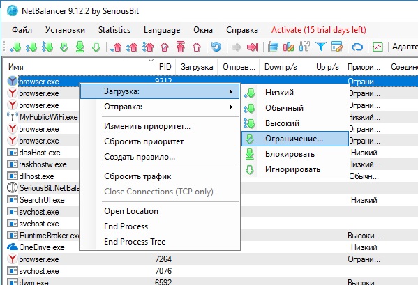 Программа распространяется бесплатно с тестовым периодом 15 дней и весит около семи мегабайт. Установив NetBalancer, выбираете приложение, которое надо ограничить на скорость интернета, из списка (в моем случае это приложение является браузер), кликаете правой кнопкой мыши, выбираете "Загрузка", далее "Ограничение" и настраиваете входящую скорость. Тоже самое и с исходящей скоростью.