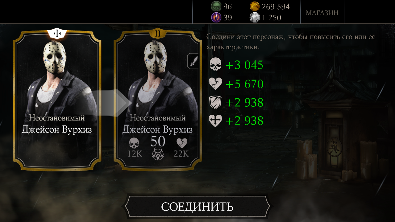 Джейсон Вурхис - это гостевой персонаж, пришел он в Mortal Kombat из «Пятница, 13-е» и зарекомендовал себя, как сильный боец. Джейсон - это конечно жесть, кто смотрел фильмы про него, тот со мной согласится (надеюсь). Этот чел бессмертен, его нельзя убить (вспоминаю кино Фредди против Джейсона), ему все побоку. Даже взять то, что Фредди отпустил на Джейсона большую пачку арматуры, а тому хоть бы хны. Ну да ладно, это кино, мы же в игре!Испытание "Джейсон Вурхис: Неостановимый", как все остальные испытания состоит из четырех башен по двенадцать боев и одной башни, где предстоит подраться четырнадцать раз с разными командами и один раз с самим Джейсоном Вурхисом.