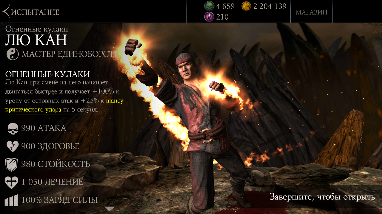После прохождения испытания игрок получает золотую карточку персонажа Лю Кан Огненные кулаки с характеристиками 990 удар и 900 жизнь. Теперь персонаж доступен в магазине за 345 душ.