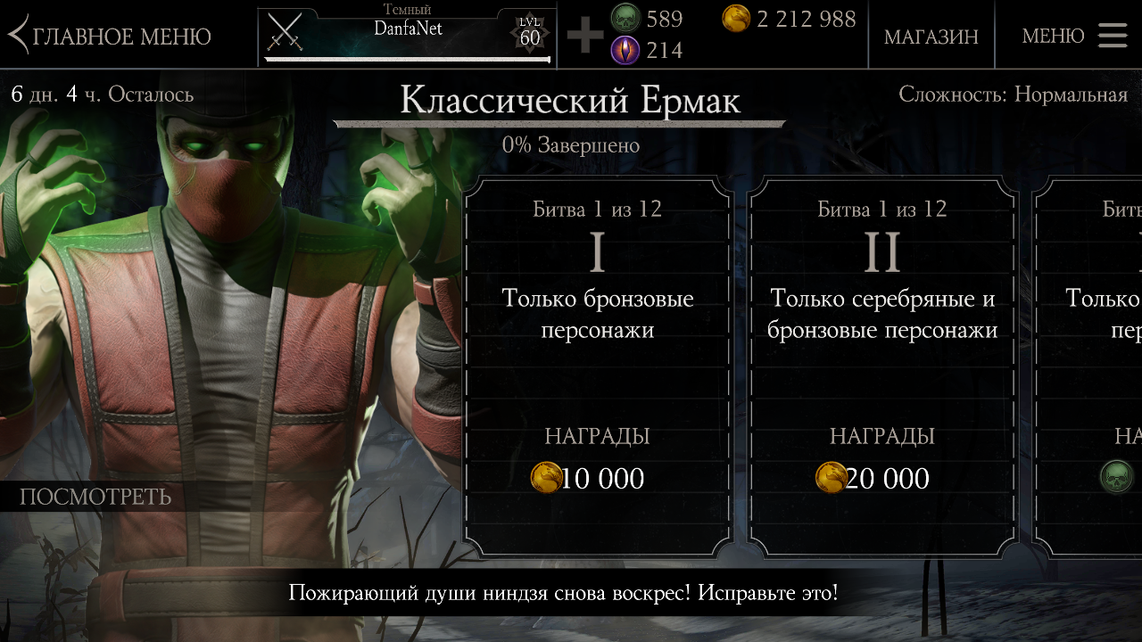 После первого прохождения испытания, игрок получит золотую карточку Классический Ермак с характеристиками: 1250 удар и 1125 жизнь. Теперь персонаж доступен в магазине за 478 душ. За второе прохождение испытание, игрок получает слияние карточки и Медальон душ.