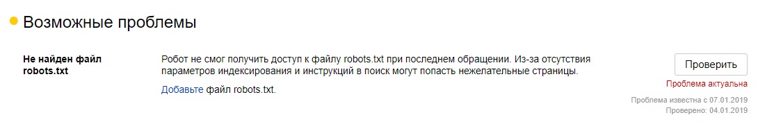 Робот не смог получить доступ к файлу robots.txt при последнем обращении. Из-за отсутствия параметров индексирования и инструкций в поиск могут попасть нежелательные страницы.