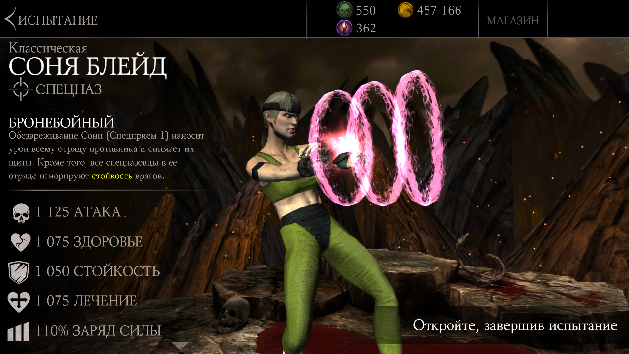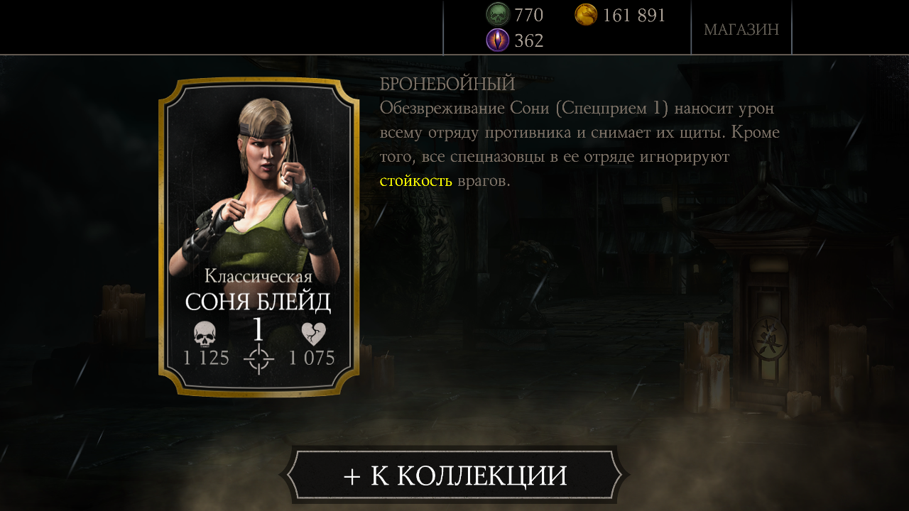 После первого прохождения испытания, игрок будет награжден золотой карточкой Классическая Соня Блейд, с характеристиками: 1125 удар и 1075 здоровья. Теперь Соня доступна в магазине персонажей за 400 душ.