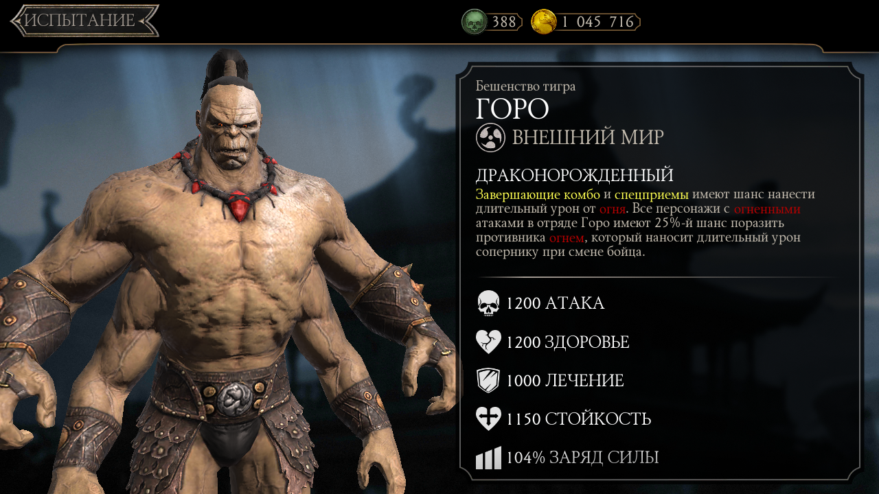 Горо "Бешенство тигра" (Внешний мир). Драконорожденный: Завершающие комбо и спецприемы имеют шанс нанести длительный урон от огня. Все персонажи с огненными атаками в отряде Горо имеют 25%-й шанс поразить противника огнем, который наносит длительный урон сопернику при смене бойца.