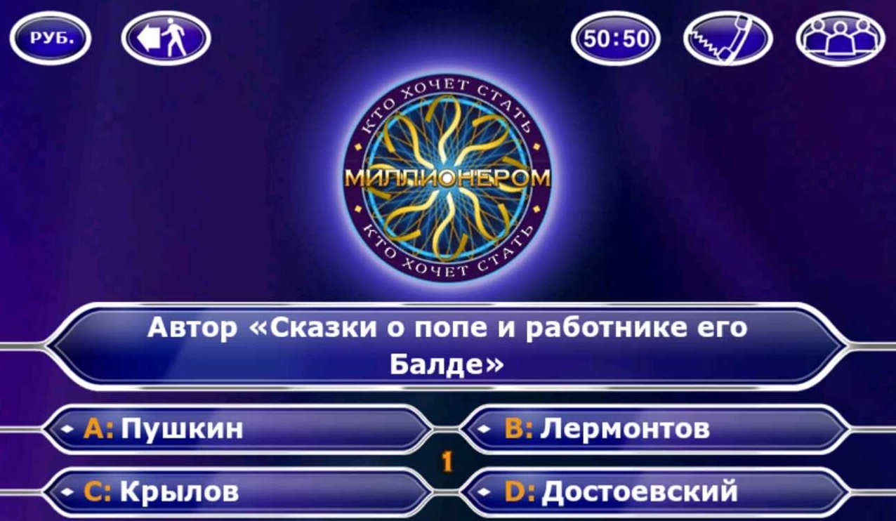 Вы устали бегать, прыгать, стрелять. Вам хочется в зимний долгий вечер укутаться в теплый плед, взять девайс и поиграть, в что-то более спокойное. Тогда вам подойдет данная игра. Сюжет взят с известной телепрограммы "Кто хочет стать миллионером". Вам будут заданы вопросы и будут предоставленные четыре ответа и только один верный. В игре присутствуют 3 подсказки: помощь зала, звонок другу и 50/50. Так что теперь вы можете проверить свою эрудицию не выходя из дома