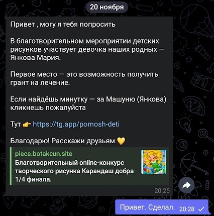 Первое, что я подумал, что почему бы не помочь, так как я помню о том, о чем писал выше. Перейдя на сайт, по ссылке в сообщении, посетило чувство, что меня разводят и я его закрыл, а мошенникам написал "Привет. Сделал.". Моя знакомая бы тут же прислала слова благодарности, но сообщение не прочитано более 12 часов.