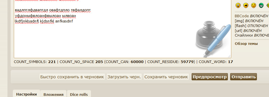 Описание: Считает количество введенных символов, символов без пробела и количество слов, а также допустимое количество символов и сколько осталось символов при создании новой темы, ответе и редактировании сообщения.