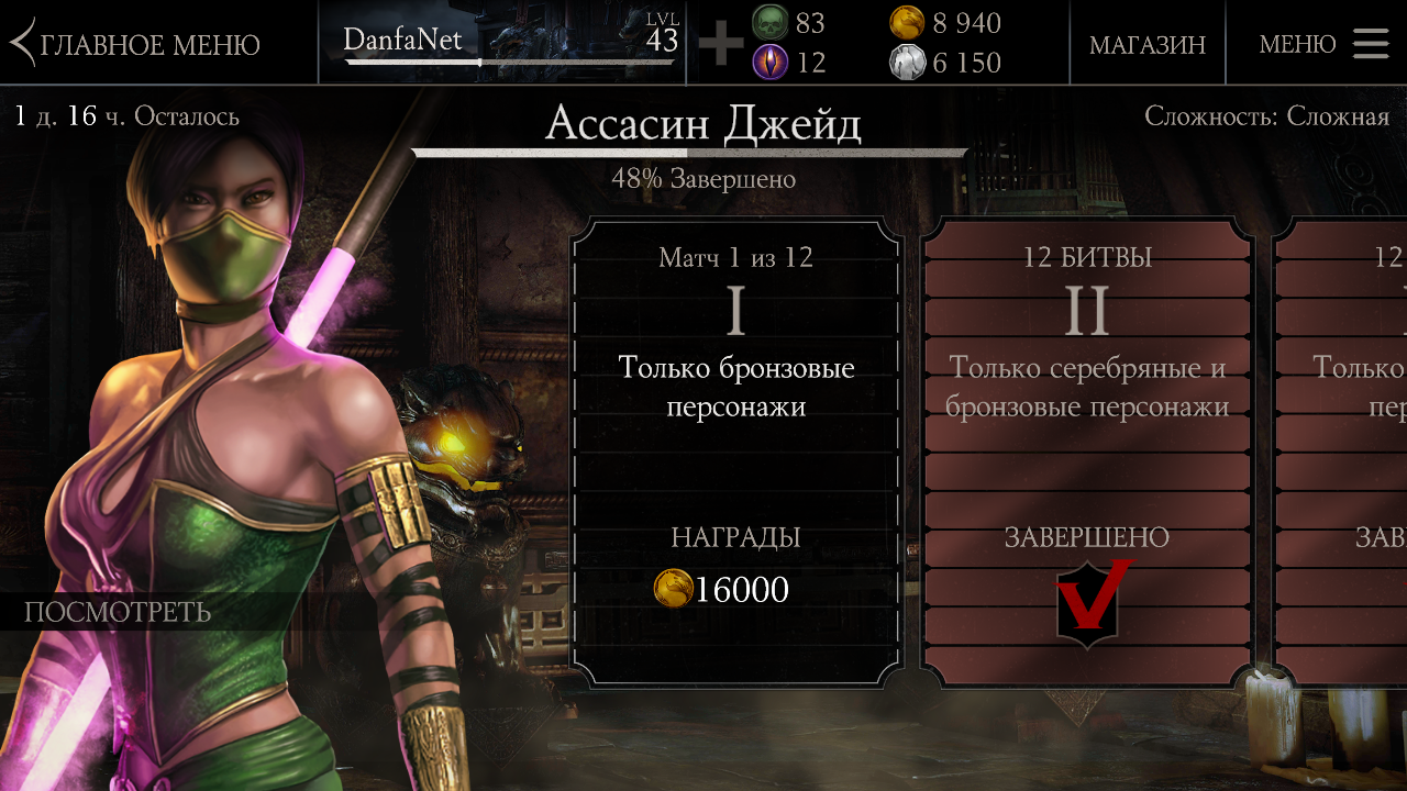На данный момент идет Испытание Ассасин Джейд. Испытание мне удалось пройти один раз, на второй раз не хватает прокачки моим персонажам. После прохождения получил золотую карточку Ассасин Джейд, плюс этот персонаж появился в магазине, теперь его можно купить за 421 душу.