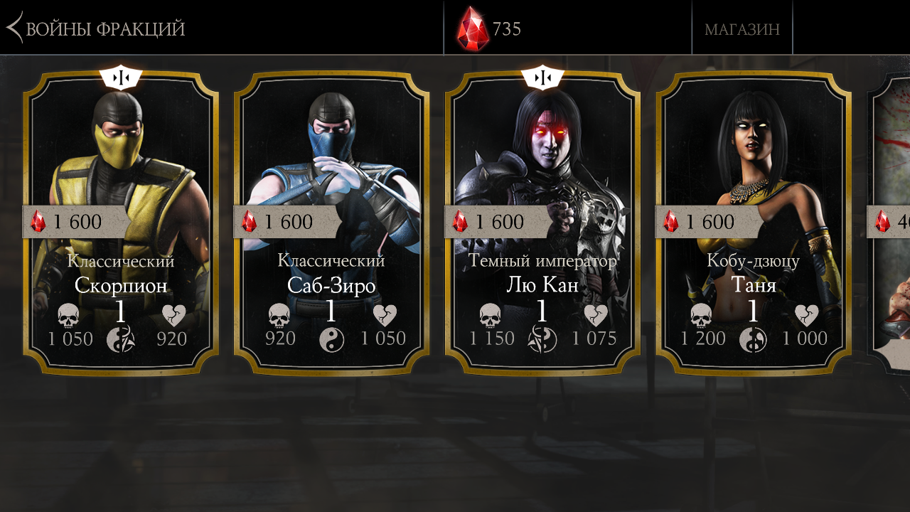 В Магазине Войн фракции представлены очень даже классные товары. В этом магазине я покупал разное снаряжение и двух персов (до сегодняшнего дня), один из них Классический Скорпион и Лю Кан: Темный император. Темный император - это "товар", который я приобрел самым первым из всего, что есть в Магазине Войн Фракции. Должен сказать, что карточка Темного императора очень интересная, классный перс. Император относится сразу к двум классам, это Преисподняя и Мастер единоборств, во многих случаях это может быть на руку игроку, я игрок, мне на руку!