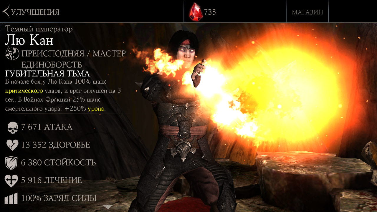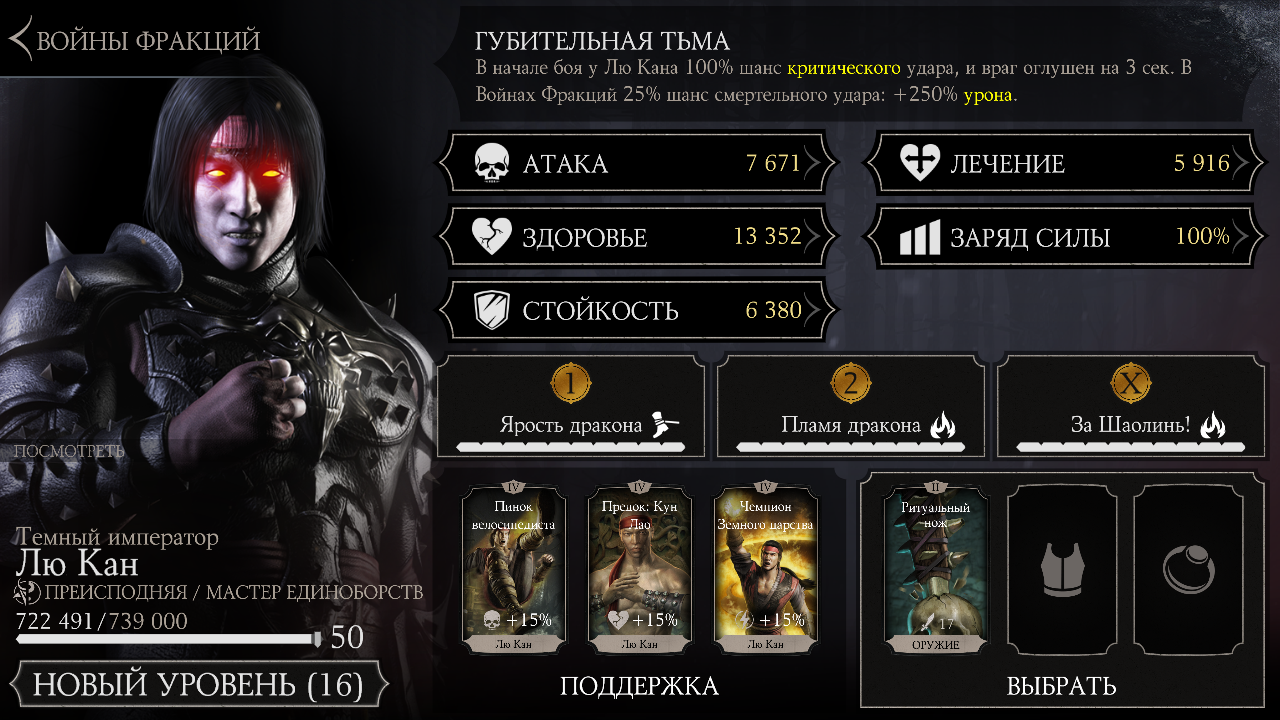 У Темного императора есть эпичная фишка, он связывает ноги противнику и тот не может сбежать, то есть текущего, вражеского противника не заменит другой вражеский противник, по куда связаны ноги. Эта фишка является первым спецприемом (спецприем: "Ярость дракона"), и этот спецприем очень полезен. Не раз был случай, когда разбиваешь противника, а он при минимальной шкале жизни меняется на другого бойца, и пока он не в бою, он зализывает раны, жизнь его при этом нарастает. Когда он выпрыгнет на поле битвы, у него будет гораздо больше шкала, чем была, когда он убегал, плюс у него будет энергия для совершения спецприема. Приходится разбивать заново. Вражеская жизнь растет еще быстрее, когда участвуешь в бою с пометкой "Враги восстанавливают свое здоровье со временем" или "Враги похищают Ваше здоровье и восстанавливают свое" (как то так), тут есть вероятность, что почти разбитый вражеский боец, вернется с полной шкалой жизни. А применив первый спецприем Лю Кана, враг не сможет удрать и его можно окончательно разорвать на мелкие карточки, после чего он уже не вернется, если, конечно, он не имеет способность воскресать и в отряде нет реаниматоров.
