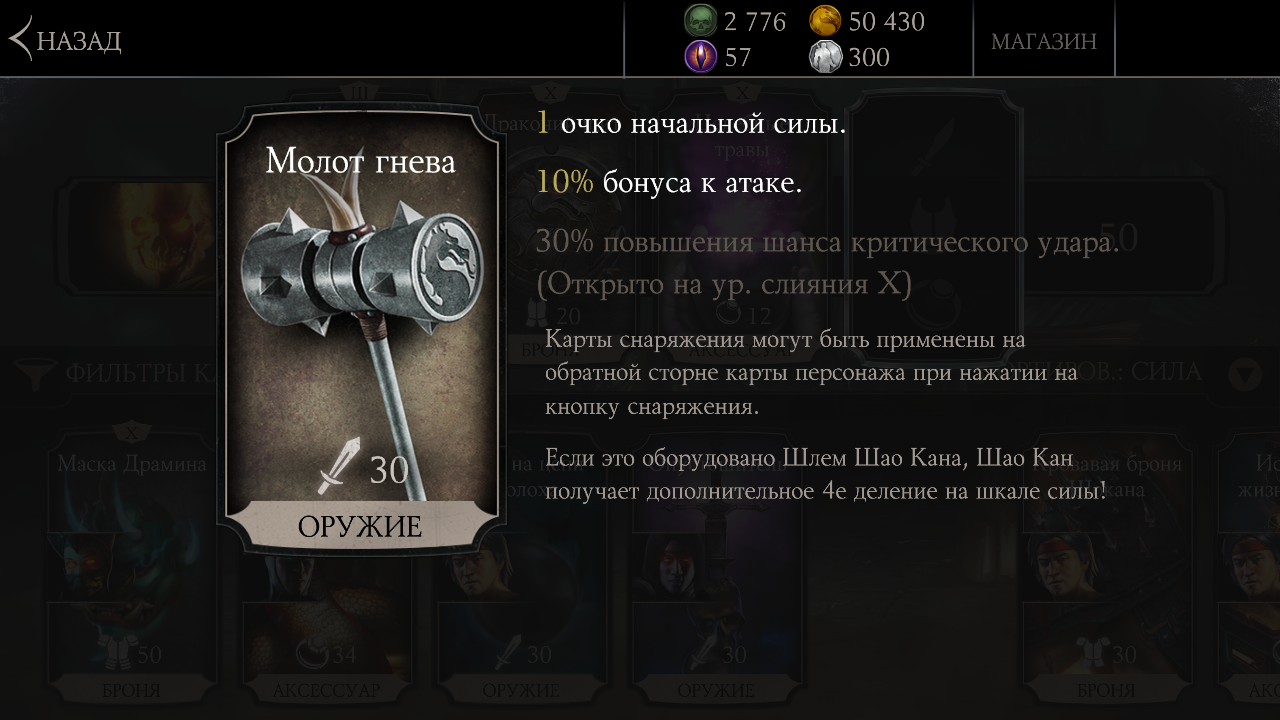 Чем же хорош этот Молот гнева? Давайте посмотрим! Значит, он дает одно очко начальной силы персонажу, который его носит. То есть, с самого начала боя, боец может выполнить первый спецприем. К тому же Молот дает бонус к атаке. Удар владельца такого оружия становиться сильнее на 10 процентов. Проценты увеличиваются с каждым слиянием. При слиянии Молота до уровня X появится 30 процентный шанс нанести критический удар. Вдогонку: "Если это оборудовано Шлем Шао Кана, Шао Кан получает дополнительное 4е деление на шкале силы!