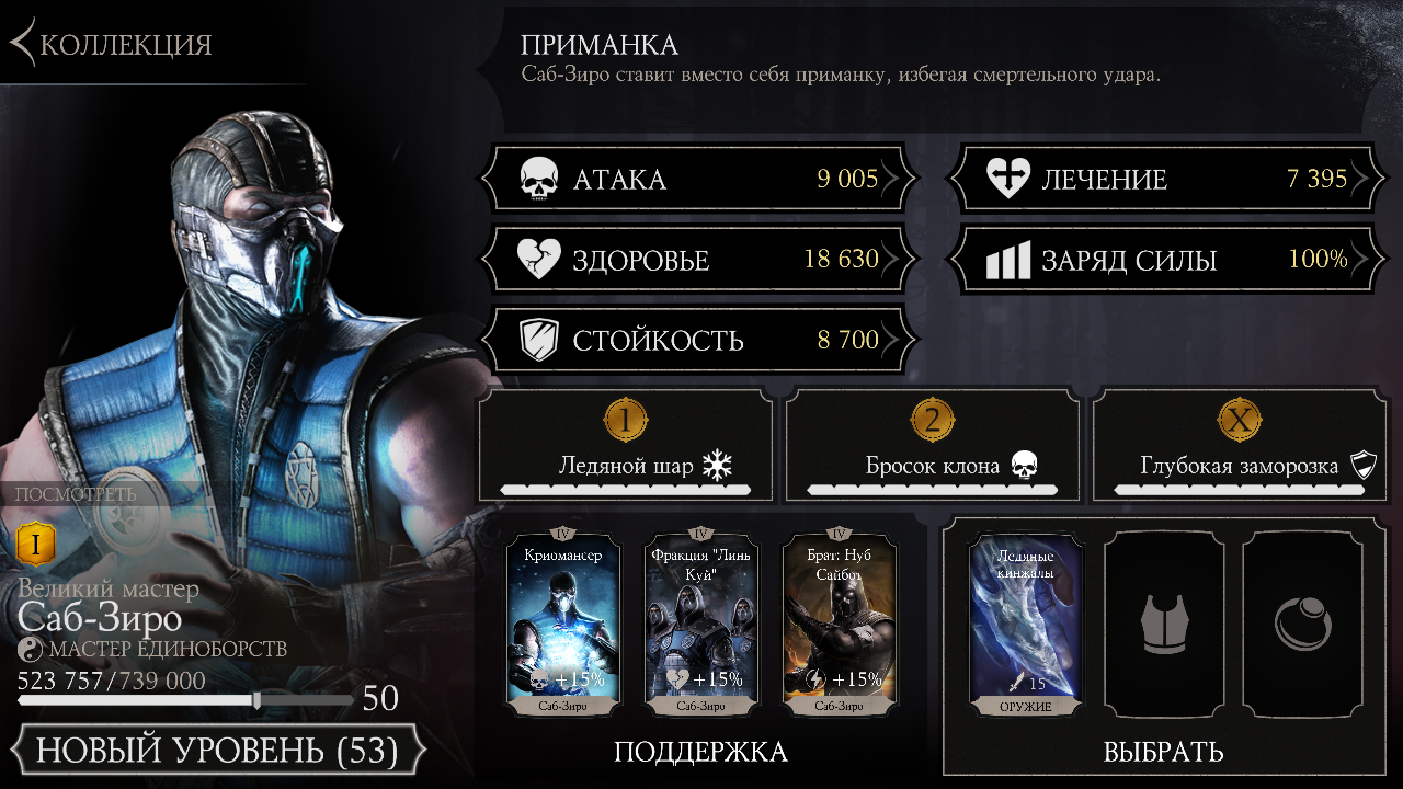 Пожалуй в MK X Mobile "Великий мастер" самый лучший перс из всех персонажей Саб-Зиро. Фишка этого перса: он ставит вместо себя приманку, что позволяет ему избегать критических ударов. Выходит у "Саб-Зирыча" две жизни, одна с полной шкалой, вторая около половины шкалы.