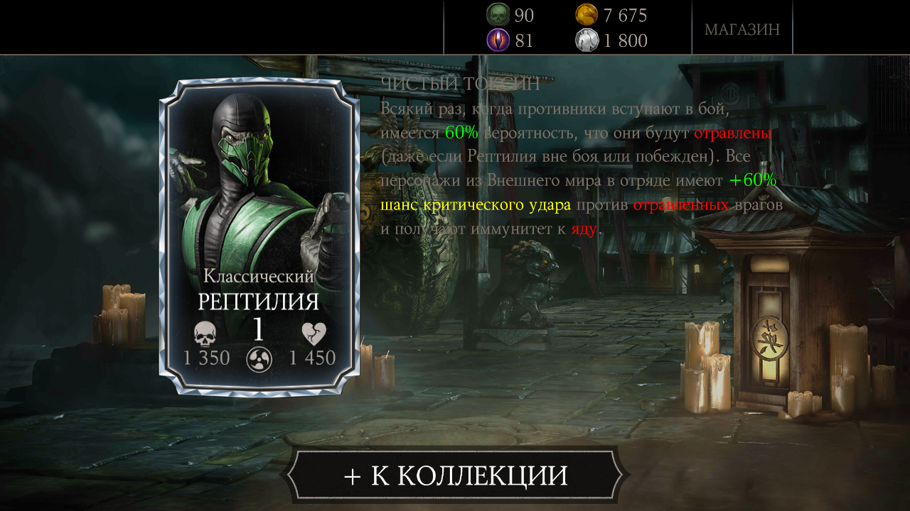 Разработчики игры MK X Mobile сказали, что в обновлении 1.18 игроков ждёт сюрприз. По всей видимости, Классическая Рептилия - это и есть тот самый сюрприз! Классический Рептилия - алмазный персонаж, очень сильный и ловкий. Заполучить его можно только в Режиме заданий, когда будет собраны зелёные рубины до 100 процентов. Собрав сотню зелёных рубинов, на карте башен режима заданий появится башня, где игрок может сразится с боссом Рептилия Классический. Победив босса, игрок получит алмазного персонажа Рептилию.