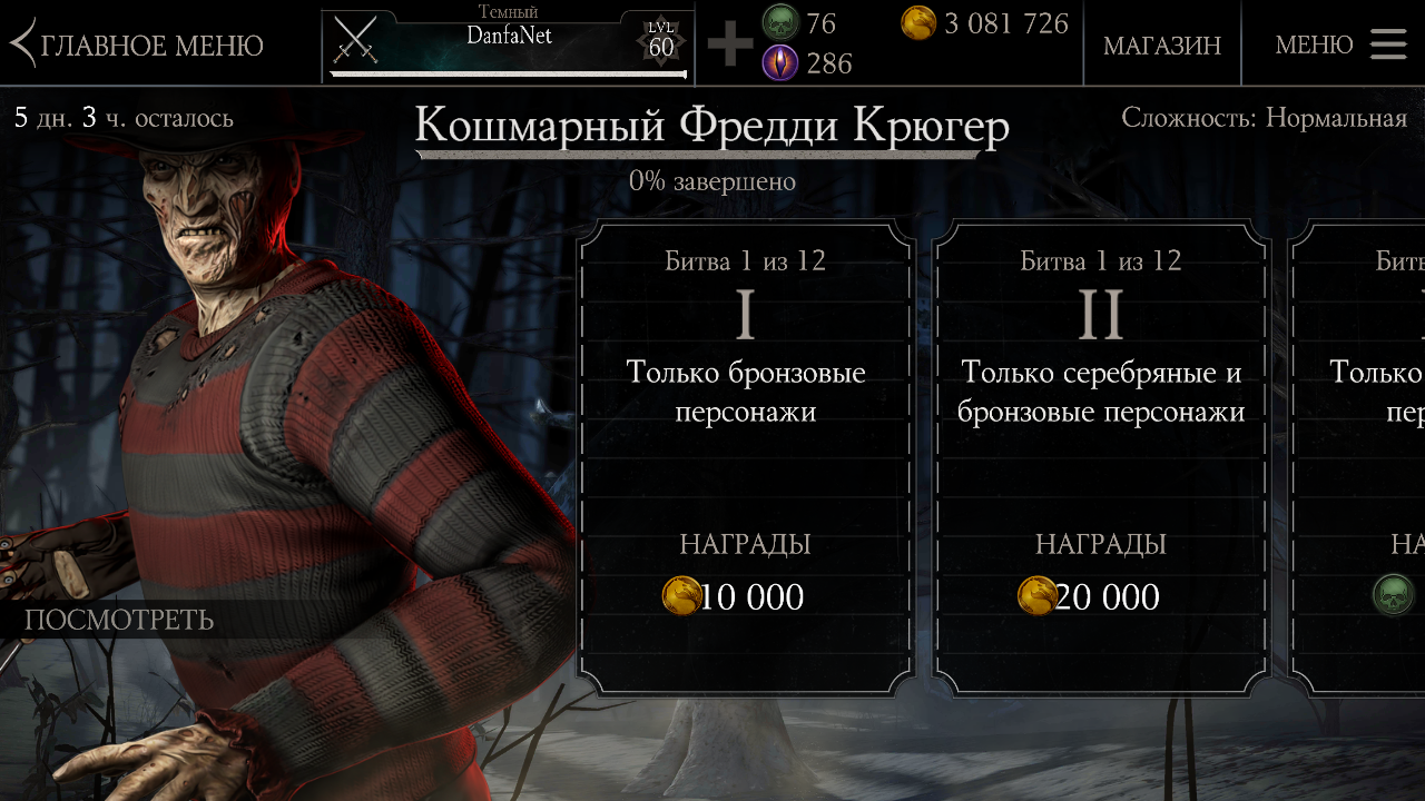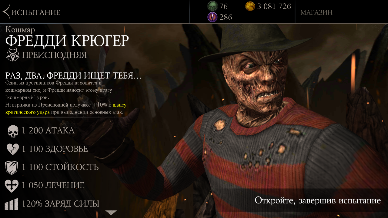 После первого прохождения испытания, игрок будет награжден золотым персонажем Фредди Крюгер с характеристиками: 1200 удар и 1100 жизнь. Теперь перс доступен в магазине за 450 душ.