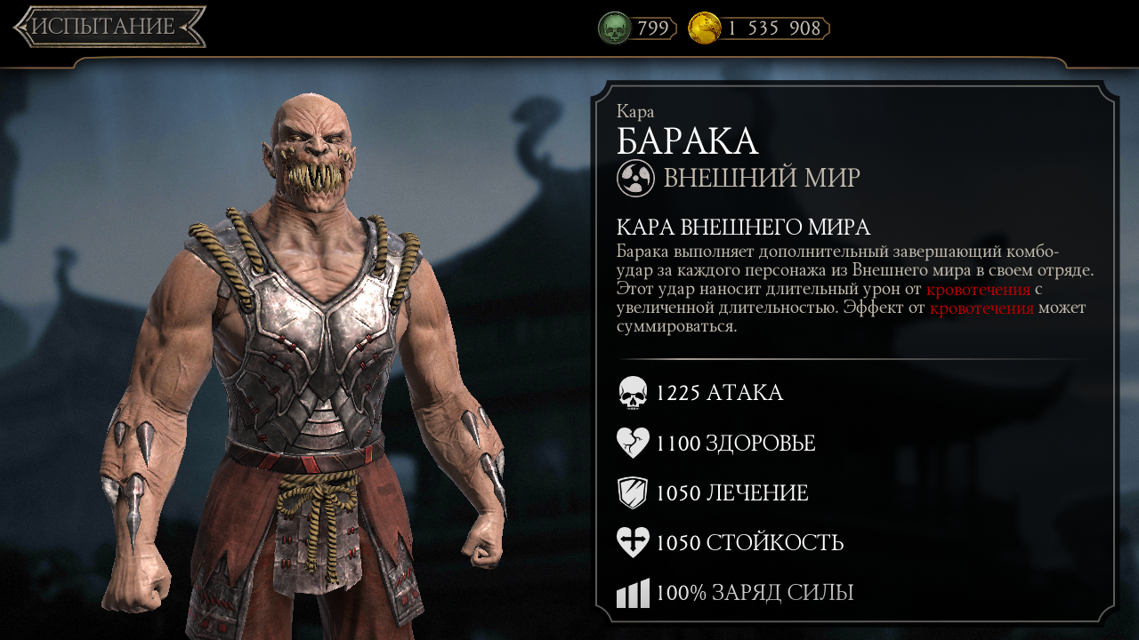 Барака выполняет дополнительный завершающий комбо-удар за каждого персонажа из Внешнего мира в своем отряде. Этот удар наносит длительный урон от кровотечения с увеличенной длительностью. Эффект от кровотечения может суммироваться.