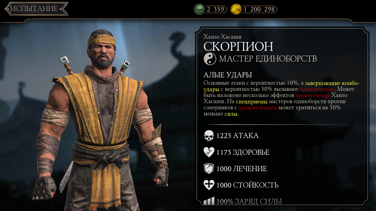 Скорпион "Ханзо Хасаши" (Мастер Единоборств): Алые удары - Основные атаки с вероятностью 10%, а завершающие удары с вероятностью 50% вызывают кровотечение. Может быть наложено несколько эффектов кровотечения Ханзо Хасаши. На спецприемы мастеров единоборств против соперников с кровотечением может тратиться на 50% меньше силы.