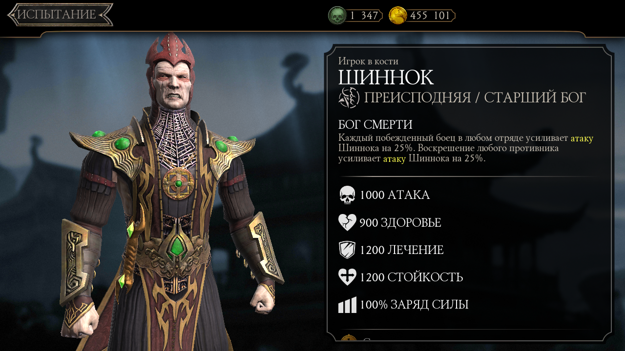 БОГ СМЕРТИ: Каждый побежденный боец в любом отряде усиливает атаку Шиннока на 25%. Воскрешение любого противника усиливает атаку Шиннока 25%.