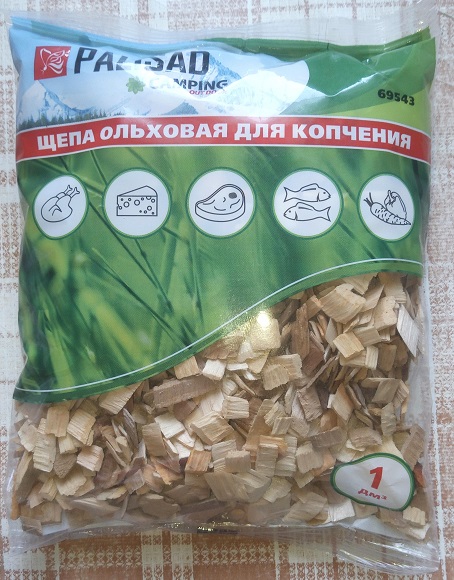Прогуливаясь по магазину, на глаза попался пакетик ольховой щепы. Я купил один, но еще не пробовал, как буду коптить, уду использовать именно эту щепу.