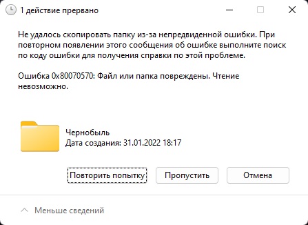 При копировании / удалении файлов появляется ошибка 0x80070570, выполните следующее: